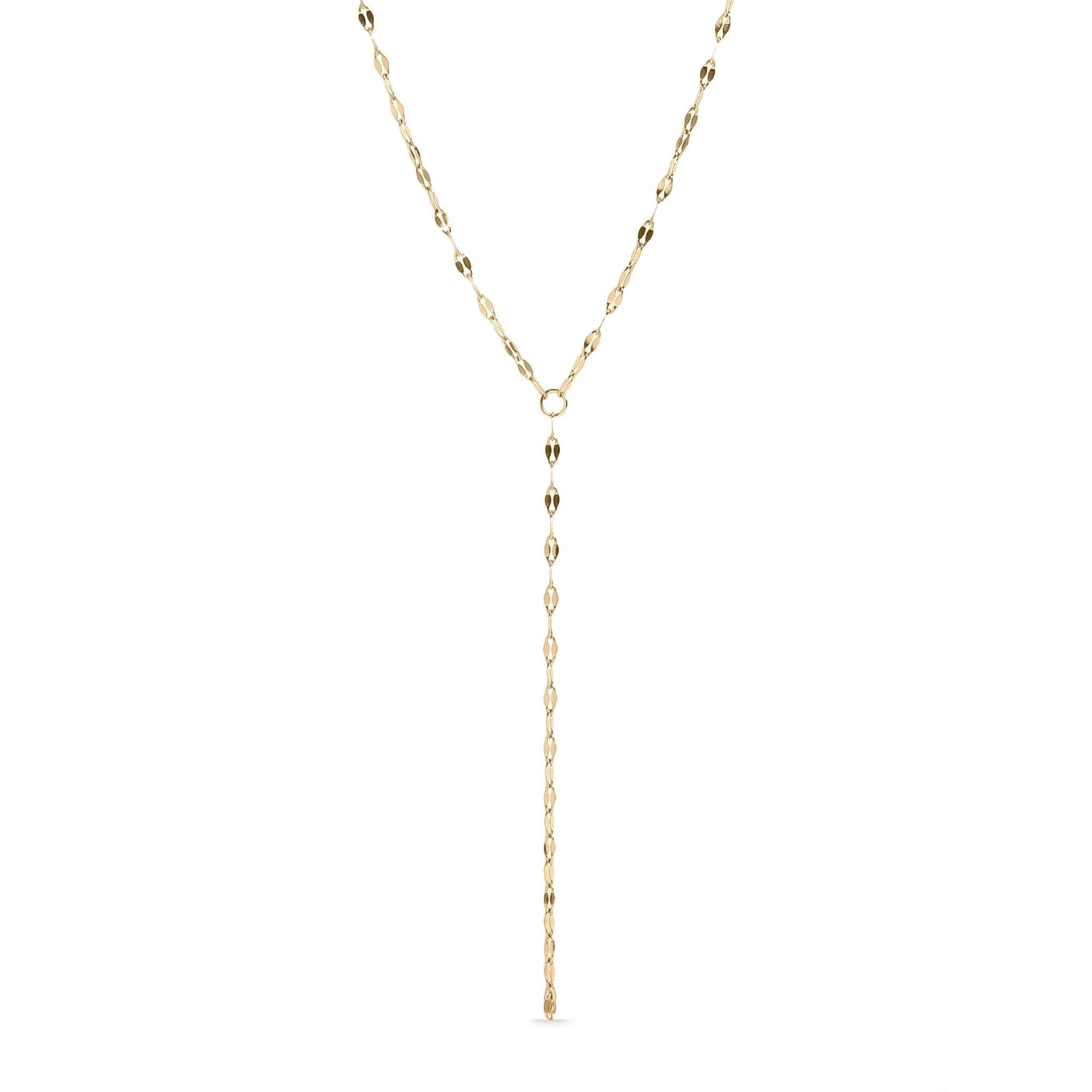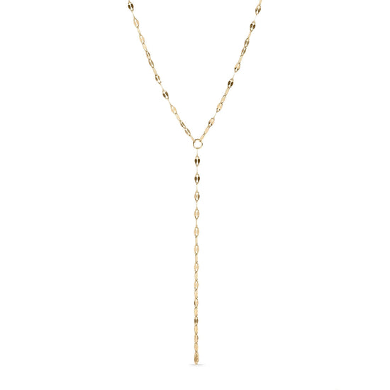 Sleek and refined, this single-strand lariat necklace features a smooth herringbone-style chain that catches the light with every movement. Flat, fluid links create a soft shimmer that feels effortless and modern, making it an easy statement on its own or layered with your favorite chains.