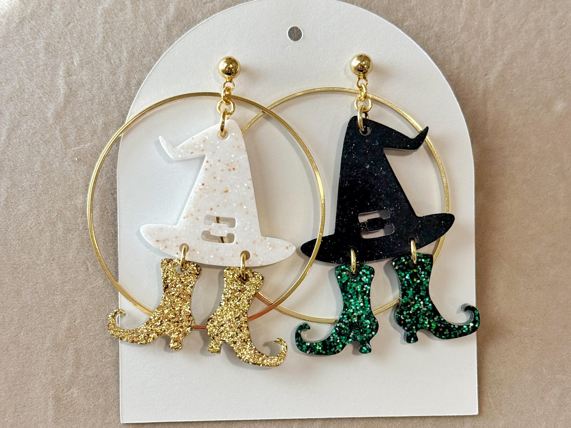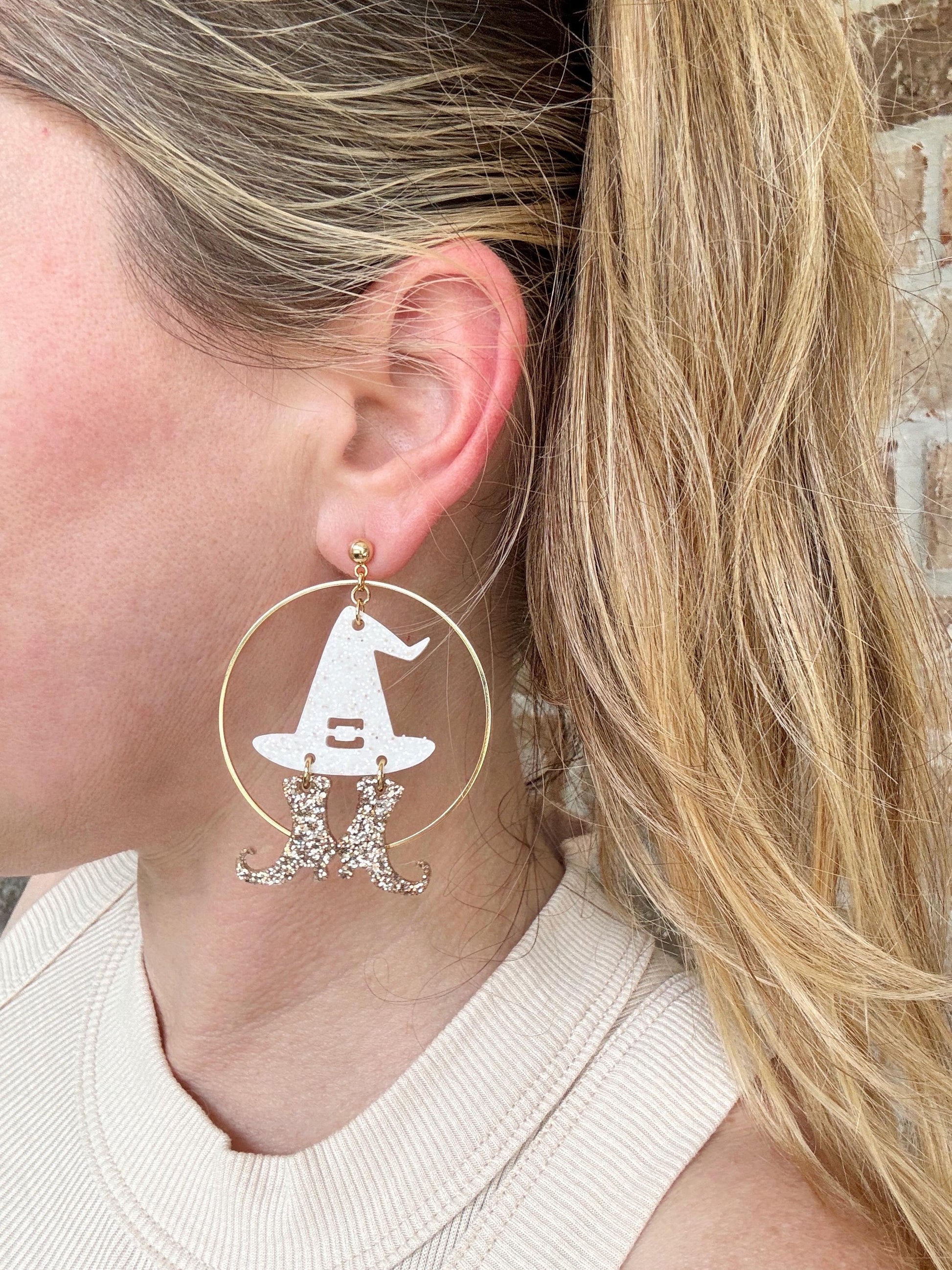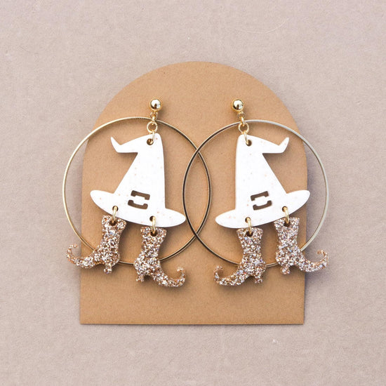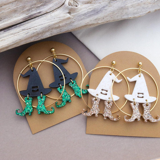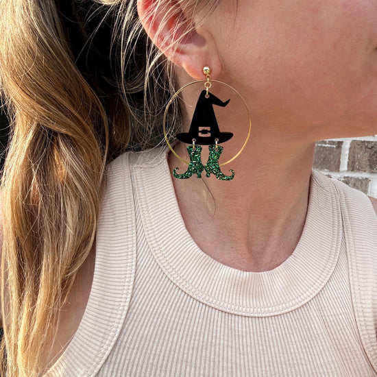 Bold, playful, and full of sparkle, the Wicked Witch Earrings are a standout piece from our Halloween Collection. Handcrafted with glitter and resin, each pair features a spellbinding shimmer designed to catch the light with every movement. Set on a round stud post and finished with a 2" hoop, these earrings bring just the right balance of statement and wearability.